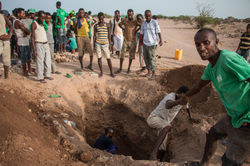 Migrants bury a fellow Ethiopian who died just a few kilometers outside of Obock, after completing the dangerous walk through the desert from Ethiopia.
